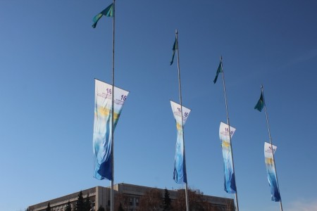Алматыда мамыражай күн райы Көк туымыз ілінген құттықтауларды желбірете түсуде.