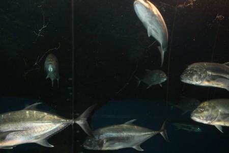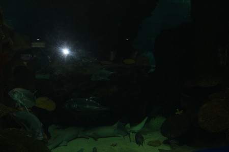 Ал бас аквариумда Мұхитаралдың ең үлкен тұрғындары - акулалар, олармен қоныстас-салмақтары мен тұлғалары жағынан акулалармен иық теңестіре алатын алып теңіз алабұғалары, үлкен патшабалықтар, жарқанат-балықтар мен басқа да үйірімен жүретін балықтар тіршілік кешуде.