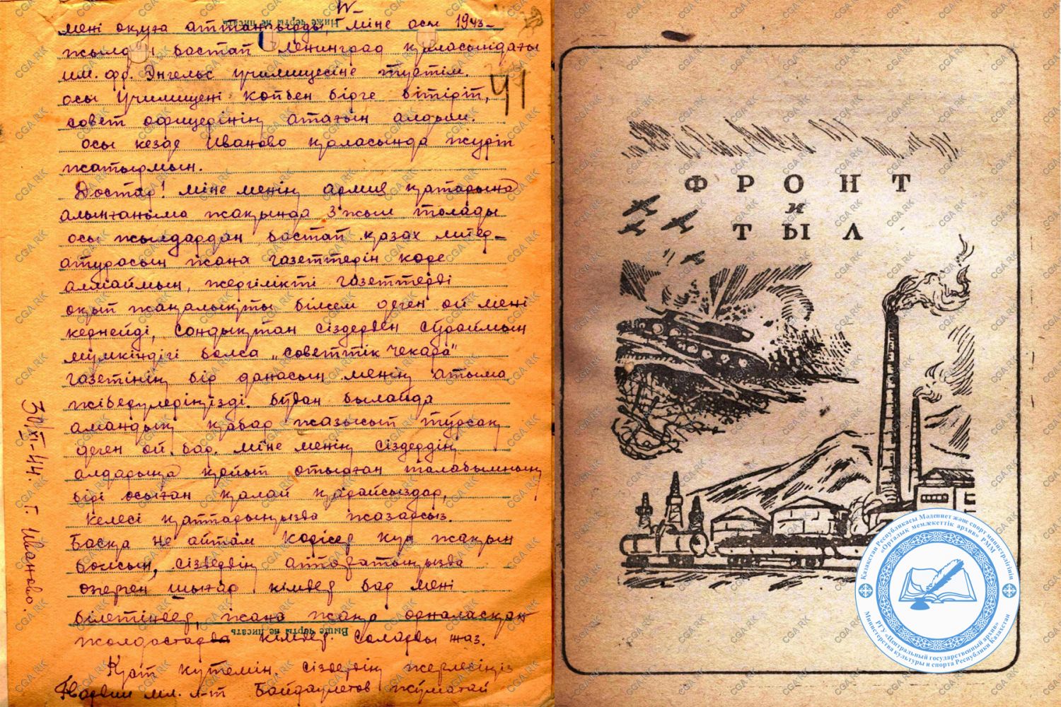 Қазақстан Республикасы Мәдениет және спорт министрлігінің Орталық мемлекеттік архивінде 1941-1945 жылдардағы Ұлы Отан соғысына қатысты сан-алуан деректері бар қорлар сақтаулы. XX ғасырдағы ең қасіретті, қантөгіс соғысты суреттейтін ресми құжаттардан басқа, соғыс тарихын зерттеу дерек көзі болып табылатын құжаттардың бірі – жеке адамдардың, майданнан тылға, тылдан майданға жазған хаттары.
