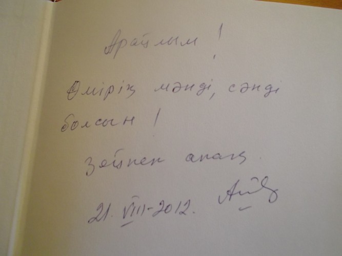 Сондай кездесулерімнің алғашқысы - біразыңызға жақсы таныс Айгүл Болатханқызымен кездесуім болды. Тамыз айының аяғында Айгүл апайдың Астанаға келетінін білген соң, Зейнеп Ахметованың «Бабалар аманаты» кітабын ала келуін өтіндім. Астанаға іссапармен келе жатса да, өтінішімді жерге қалдырмай тамаша кітаптың екі данасын алып келді. Айгүл апай ашық мінезді, өзінің жазбаларындағыдай сөздері салмақты, мейірімді жан екен. Шай ішіп, асықпай әңгімелесуге уақыт тығыз болған соң, автордың қолтаңбасы қойылған екі кітапты құшақтап үйге қайттым)))