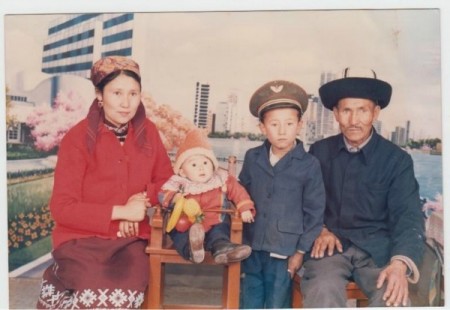 (бұл менің 8-9 ай шамасындағы кезім. Нағашы атам, анам және нағашы ағам. Анамның көйлегіне қарап-ақ суретке түсердің алдында не бүлдіргенімді байқап тұрған боларсыз)