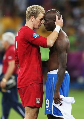 Англия құрамасының қақпашысы Джо Харт пен Италия құрамасының шабуылшысы Марио Балотелли.
