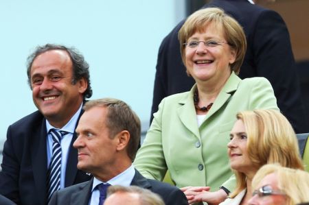 Германияның канцлері Ангела Меркель мен УЕФА-ның президенті Мишель Платини Германия - Грекия арасындағы ойында.