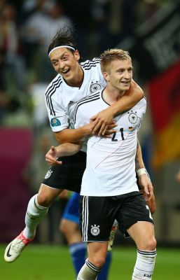 Марко Ройс пен Месут Озилдің гректерге соғылған голға қуануы.