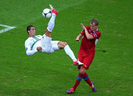 Криштиано Роналду Чехия құрамасының қақпасына соққы жасауда.