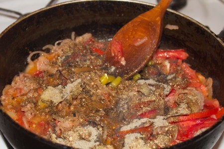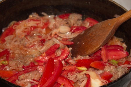 ![]() | Алдымен пиязды, кейін қызанақты, етті жақсылап қуырамыз. |
