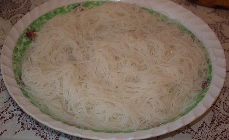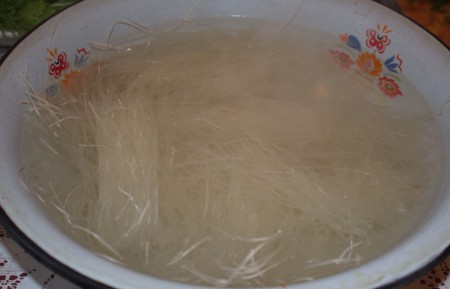![]() | Шұңғыл ыдысқа фунчоза вермешелін салып, қайнап тұрған суды қоямыз да, 10-15 минут бұқтырып қоямыз. |