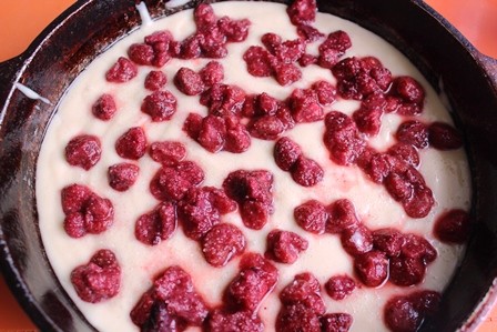 | Үстінен қантпен араласқан жидектерді жайғастырамыз. Басты ереже – олар салмағымен бәліштің көтерілуіне кедергі болмауы керек. | |