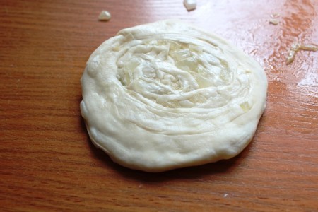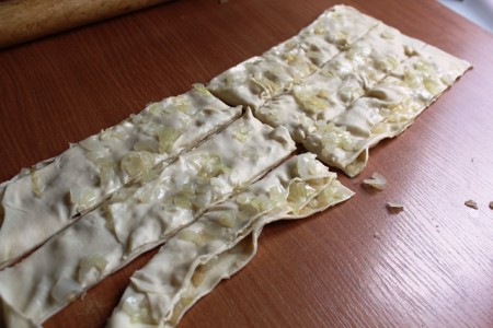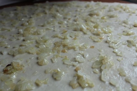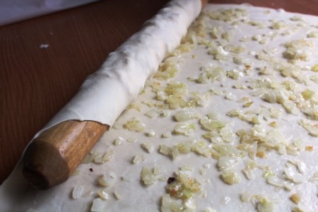 | Қамырды барынша жұқа қылып жайып, бетін шамалы майлаймыз. Үстіне қуырылған пиязды жаямыз. | |