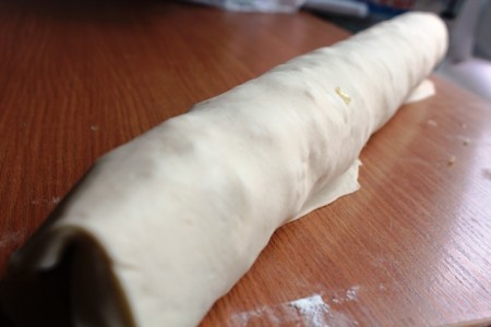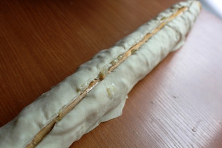 | Қамырды оқтаудың соңына дейін ораймыз. | |
