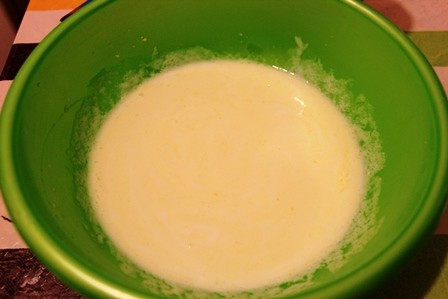 | Ұнды айран мен тосапқа қосып, қамыр илейміз. Қамыр құймақтың қамырынан сәл қою болуы керек. | |