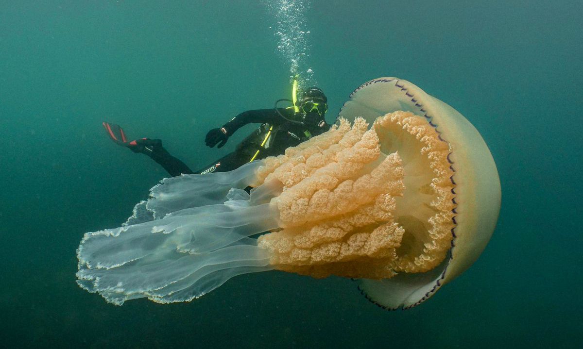 Дайверлер алып медузаны Ұлыбританиядағы Корнуолл жағалауынан кезіктірді. Олар су астындағы таңғажайып тіршілік иесін көріп, суретке түсіріп үлгерген.