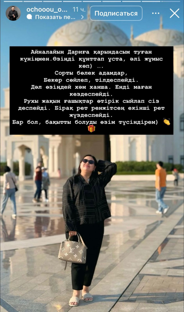"Айналайын Дариға қарындасым, туған күніңмен. Өзіңді құнттап ұста, әлі жұмыс көп. Сорты бөлек адамдар бекер сөйлеп, тілдеспейді. Дәл өзіңдей хәм ханша енді маған кездеспейді. Рухы жақын ғашықтар өтірік сыйлап, сіз деспейді. Бір-ақ рет ренжітсең, екінші рет жүздеспейді. Бар бол, бақытты болуды өзім түсіндіремін", - деп жазды ол.