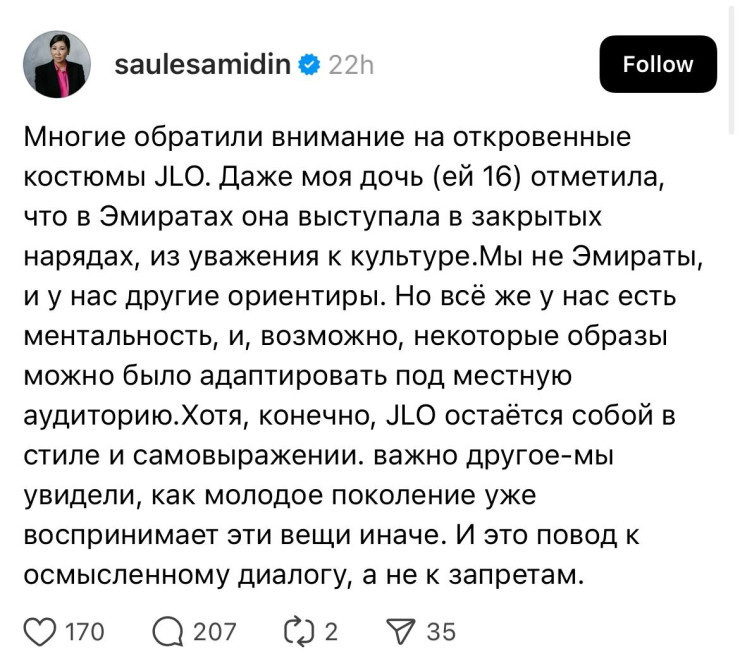 "Көпшілік JLO-ның ашық костюмдеріне назар аударды. Тіпті қызым (ол 16 жаста) әнші Әмірліктердің мәдениетін құрметтеп, жабық киім кигенін айтты. Біз Әмірліктер емеспіз, біздің құндылықтарымыз бөлек. Бірақ бізде де менталитет бар, кейбір образдарды жергілікті аудиторияға бейімдеуі керек еді. Дегенмен, әрине, JLO өз стилі мен болмысынан аттап кете алмайды. Бірақ маңыздысы - жас ұрпақтың бұл нәрселерді басқаша қабылдай бастағаны. Бұл - тыйымдарға емес, мағыналы диалогқа себеп", - деп жазды ол.