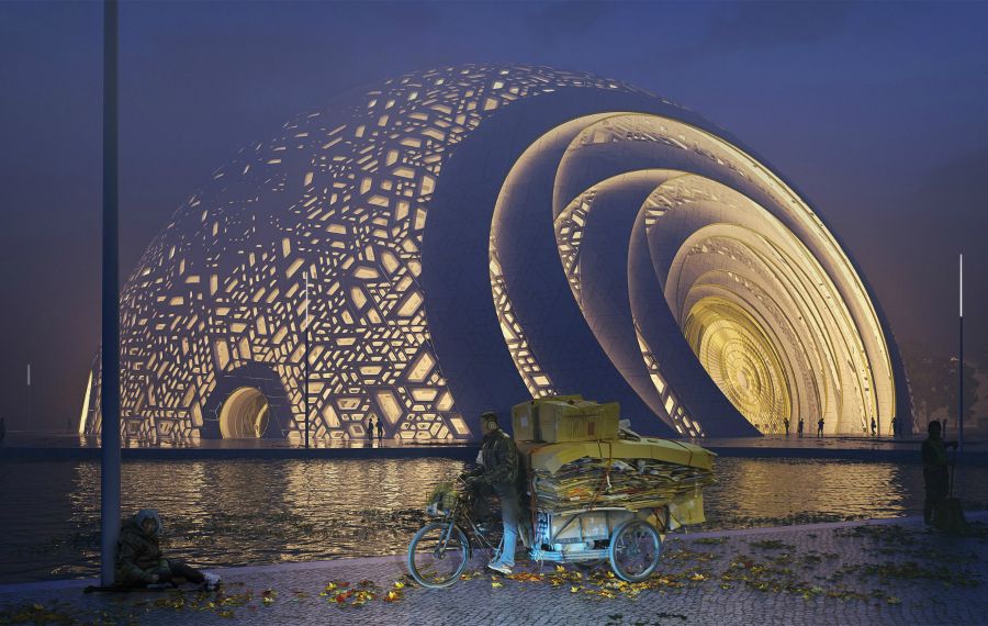 Ғимарат Гуанчжоу қаласында салынады. Аталған ғимарат үлкен шар тәрізді болып, ішіне 2 мың көрерменді сыйдыра алады. Конструкция темір бетоннан, ал сырты әйнекпен безендіріледі. Ғимаратты безендіретін ою-өрнек жасанды сана арқылы салынады.