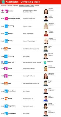 Назарларыңызға бүгін Лондон төріне шығатын Қазақстанның спортшылар тізімін ұсынамыз. Бүгін алтын медалға басты үміткеріміз, ауыр атлет - Зулфия Чинчанло шығады. Сонымен қатар, қоржынымызға тағы бір алтын салады деген былғары қолғап шеберіміз - Ғани Жайлауов та ринг төріне шығады. Басқа спорт түрлерінен Ераслава Шведова (теннис), Сергей Лим (дзюдо), Галина Воскобоева (теннис), Мөлдір Әзімбай (көркем гимнастика) және т.б спортшылар жарыс жолында бақтарын сынайды.