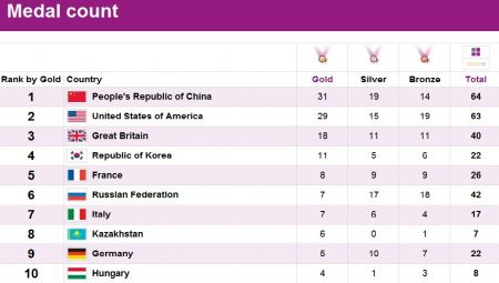 Енді алғашқы он күндік жарыс нәтижелерін қорытындылай кетсек, Қытай құрамасы жалпы есепте 64 медальмен (31, 19, 14) әлі де көш басында. АҚШ елі 63 медальмен (29, 15, 19) 2 орынға тұрақтады. Ал үздік үштік қатарында 18 алтын, 11 күміс және 11 қола медаль иеленген жарыс қожайындары. Өз кезегінде қазақстандық спортшылар алты алтын, бір қола медальға қол жеткізіп, сегізінші орынды иеленді.