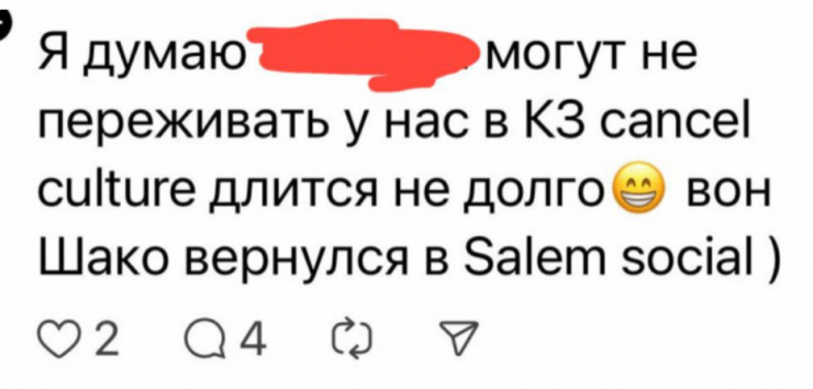 "Бізде "cancel culture" ұзаққа созылмайды. Міне, Шако Salem Social-ға қайта келді", – деп жазды қолданушылардың бірі.