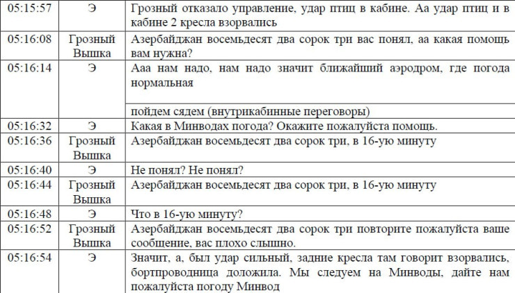 Әрі қарай экипаж Грозныйдағы мұнарамен байланысуға тырысты. Ұшқыштар 2 соққы құстардың соқтығысуынан болды деп шешті.
