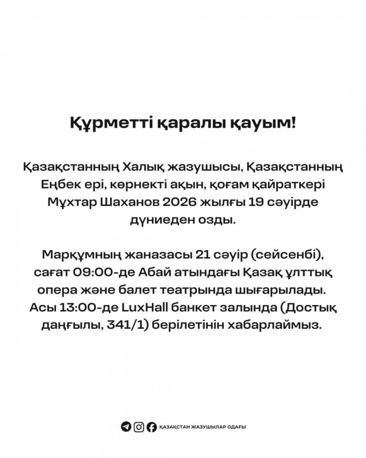 Айта кетейік, 19 сәуірде Қазақстанның Халық жазушысы, Еңбек Ері, көрнекті ақын, драматург, қоғам қайраткері Мұхтар Шаханов 84 жасқа қараған шағында дүниеден озды.