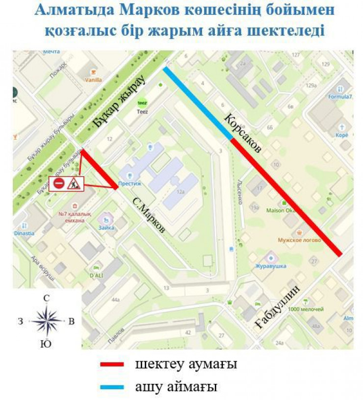 Сондықтан 3 шілде мен 25 тамыз аралығында Марков көшесінің бойымен – Бұқар Жырау бульварынан "Зайка" балабақшасына дейінгі аралықта көлік қозғалысы екі бағытта да тоқтатылады.