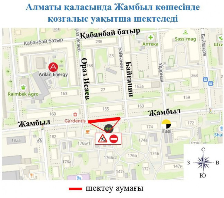 "Осыған байланысты 15 тамыз сағат 23:00-ден бастап 18 тамыз сағат 07:00-ге дейін Жамбыл көшесімен Исаев көшесінен бастап Байғанин көшесіне дейін көлік қозғалысы жабылады", - деп жазылған хабарламада.