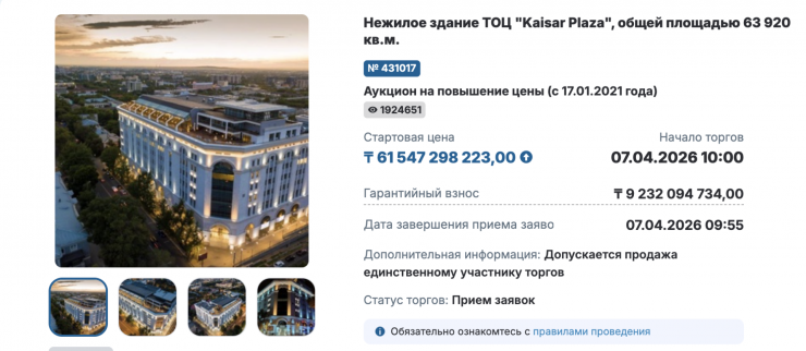 7 сәуірде Kaisar Plaza бизнес орталығы аукционға 61,5 миллиард теңгеге шығарылды. Сауда-саттықты бағаны көтеру әдісімен өткізу жоспарланған болатын. Хабарландыру 2 миллионға жуық қаралым жинағанымен, бірде-бір сатып алушы табылмады.