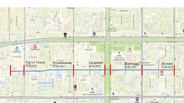 22 тамыз сағат 23:00-ден 23 тамыз 06:00-ге дейін мына көшелер жабылады: