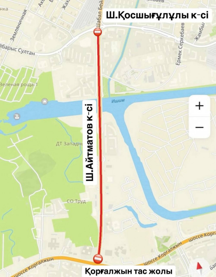 "Осыған байланысты 23-26 қыркүйек аралығында бұл учаске ішінара жабылады. Жұмыстар Қорғалжын тасжолынан Ш.Қосшығұлұлы көшесіне қарай жүргізіледі. Қозғалыс Ш.Қосшығұлұлы көшесінен Қорғалжын тасжолына қарай бір бағытта ғана ұйымдастырылады", - деп жазылған хабарламада.