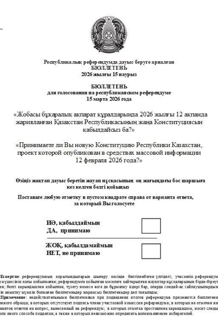 Орталық сайлау комиссиясы Жаңа Конституцияға байланысты референдумда дауыс беруге арналған бюллетень қандай болатынын көрсетті, - деп хабарлайды Massaget.kz тілшісі.