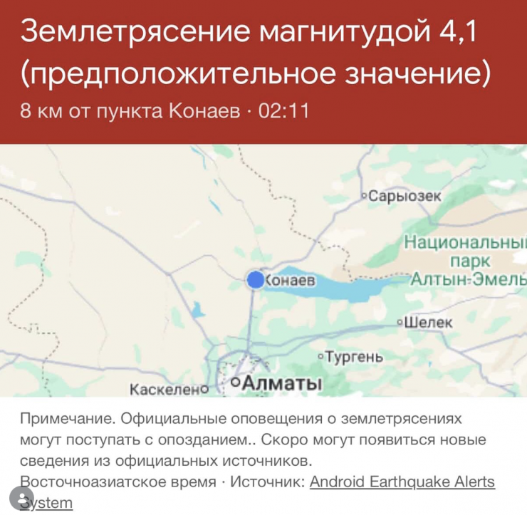"Әлеуметтік желілер мен мессенджерлерде Қонаев қаласынан 8 шақырым қашықта магнитудасы 4,1 болатын жер сілкінісі тіркелгені туралы ақпарат тарап жатыр. ҚР ТЖМ "Сейсмологиялық зерттеу институты" ЖШС сейсмикалық станциялар желісінің дерегіне сәйкес Алматы облысы аумағында және Қонаев қаласының маңында жер сілкінісі тіркелмеді. Тұрғындардан өтініштер түскен жоқ, қираған ғимараттар мен зардап шеккендер туралы мәлімет тіркелмеді", - деп жазылған ведомство жауабында.