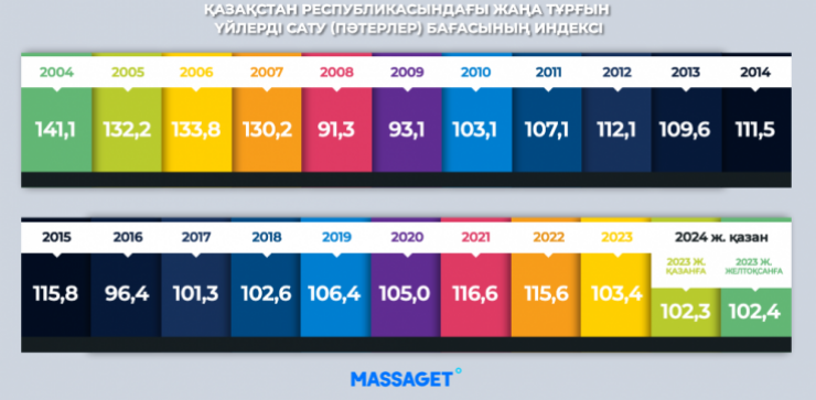 "2004-2024 жылдардағы пәтерлерді қайта сату бағалары индексінің динамикасы бойынша бағаның күрт төмендеуі 2008 жылы 20,4 пайыз тіркелді, сонымен қатар 2009 жылы - 6,1 пайызға, 2017 жылы - 1,6 пайызға, 2016 жылы 0,7 пайызға, 2023 жылы - 3,7 пайызға төмендеді", - делінген жауапта.