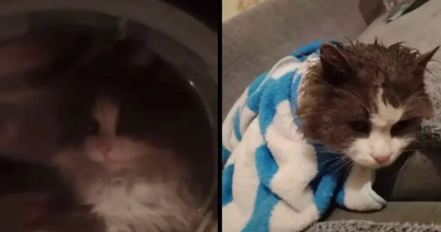 Видеода мысық кір жуғыш машинаның барабанында отырғаны көрінеді. Машина қосулы, жуу режимі жүріп жатыр. Бейнежазбадан жануардың ішінде қанша уақыт болғаны және жағдайдың немен аяқталғаны нақты түсініксіз.