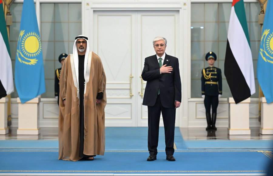 Құрмет қарауылының бастығы рапорт берген соң Қазақстан мен Біріккен Араб Әмірліктерінің мемлекеттік әнұрандары шырқалды.