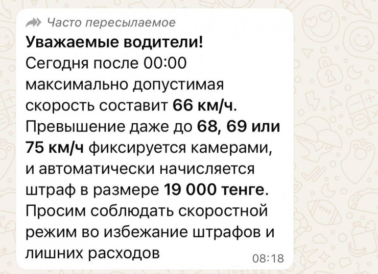 "Мұндай өзгерістер енгізілген жоқ. Елді мекендерде жеңіл көліктер үшін рұқсат етілген стандарт жылдамдық - 60 шақ/сағат. Камералар жылдамдықты 70 шақ/сағ және одан жоғары болған кезде ғана тіркей бастайды. Тексерілмеген хабарламаларға сенбеңіздер, ресми ақпаратқа жүгініңіздер. Жол ережелерін сақтап, мұқият болыңыздар!" - деп жазылған хабарламада.