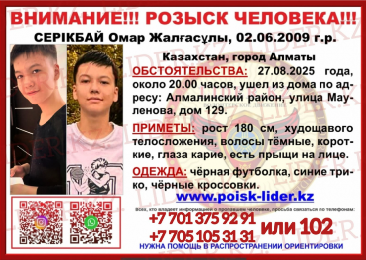 Қозғалыс өкілдері жасөспірім жайлы қандай да бір дерегі бар қазақстандықтарды іздестіру қағазында көрсетілген телефондарға немесе "102" нөміріне хабарласуды сұрайды.