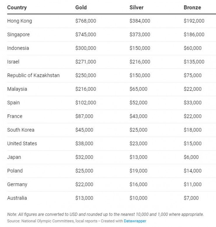 Сингапур да бұдан қалыс қалмайды. 745 мың доллар береді. Индонезия Олимпиадада бірінші болғандарға 300 мың доллар, Израиль 271 мың доллар береді.