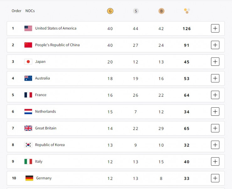 Жалпыкомандалық есепте АҚШ құрамасы көш бастады. Олар 40 алтын, 44 күміс, 42 қола медальмен соңғы сәтте Қытайды басып озды. Қытайлықтар 40 алтын, 27 күміс, 24 қоламен екінші орыннан көрінді. Үздік үштікті 20 алтын, 12 күміс, 13 қола медаль иеленген Жапония құрамасы түйіндеді.