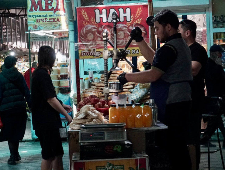 Сауда нүктелерінің арасында анар шырынын жасайтын сатушы бар. Ақкөңіл сатушы әңгімеден қашпайды.