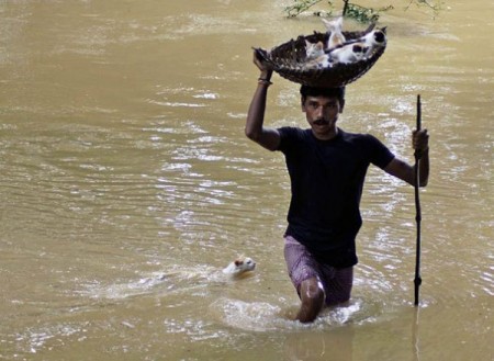 Мысық соқырларын топан судан құтқарып жатқан ер адам. Каттак қаласы.