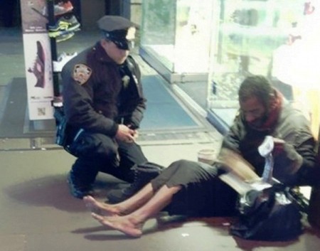Нью-Йорк полицейі Ларри Депримо Тайм-Скверде кезекшілігін атқару кезінде көшедегі бір шарасыздың аяқ киім көлемін сұрап алады. Бірер уақыт өткен соң ол қыстық аяқ-киім алып, замандасына ұсынады. Ұсынып қана қоймай, шұлығымен бірге кигізеді. Көшеде кетіп бара жатқан бір әйел бұл істі көріп қалып, суретке түсірген. Әлден уақытта бұл сурет Facebook бетінде пайда болды.