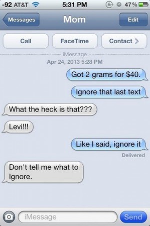 Канадалық күлегеш туиттер-аккаунтында ата-аналарын алдап соғудың ең бір «керемет» тәсілін ұсыныпты: келісе кеткен жастар «2 грамм бар, құны 40 доллар» деп, ал кейін «Кешір, бұл саған арналмаған еді» деген мәтіндері бар SMS жазған. Бұдан кейін ата-ананың жазған жауабын әркім өз микроблогында жариялауы керек болған.