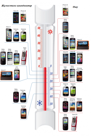 Фин сайты MikroPC телефон құрылғылардың суыққа төзімділігіне краш-тест жасады. Тәжірибеге 16 танымал телефон маркаcы таңдалды: iPhone 4S, iPhone 4, Nokia C1-01, Nokia C2-02, Nokia C5-00, Nokia C5-03, Nokia C6-01, Nokia E7, Nokia E65, Nokia N8, Nokia N9, Nokia 700, HTC Evo 3D, Samsung Galaxy S Plus, Samsung Gio, Samsung Mini, Samsung Galaxy S II, Samsung Xcover.
