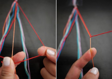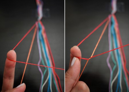 1. Сол жақтай бастаймыз. Ең соңғы жіпті (қызыл) алып, оң жақта ең жақын тұрған сарғыш түсті жіпке байлау керек. Ол үшін қызылды сарғыштың үстінен төрт (4) санын еске салатын пішін бойынша өткіземіз де, кейіннен құрылған ілмек ішінен өткіземіз.