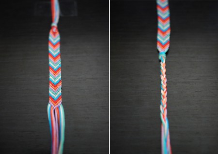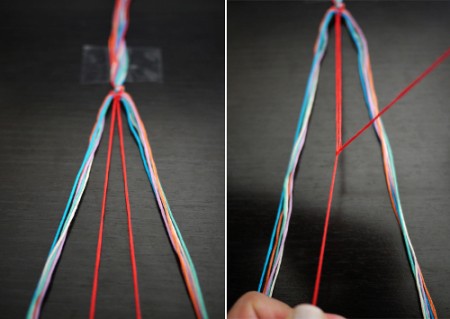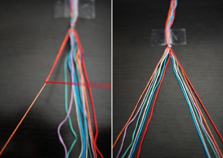 Ең алдымен жіптердің барлығын 60 см етіп кесіп алыңыз. Сізде әртүрлі түсті 12 жіп болу керек (бір түстен екі жіп). Жіптерді бірыңғай етіп орналастырып, түйіндеп қойыңыз. Түйіннің үстінен скотчпен үстелге жапсырып қойыңыз. Түйрегішпен диванға қадауға да болады.