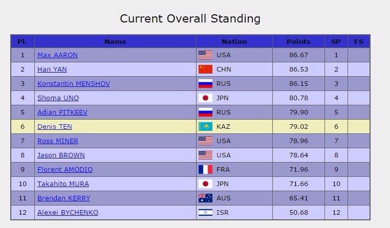Сочи Олимпaиадасының қола жүлдегері Денис Тен қысқа бағдарлама қорытындысы бойынша алтыншы орынға тұрақтады. Отандасымыз 79,02 ұпай жинады. Бірінші орынға шыққан америкалық Макс Аароннан 7,65 ұпайға қалып қойды. Екінші орыннан қытайлық Хань Янь көрінсе, үштікті ресейлік Константин Меньшев қорытындылап тұр.
