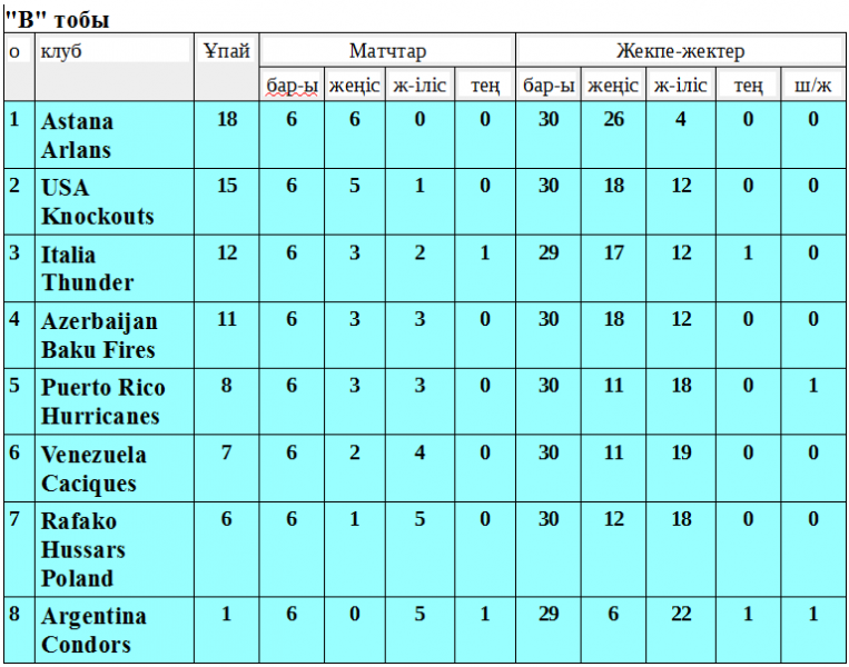 Қазақстандық клуб осыған дейінгі алты кездесуін де жеңіспен аяқтады. «В» тобында көш бастап келеді. Ал «А» тобында Кубаның «Cuba Domadores» кллубына тең қарсылас табылмай тұр.