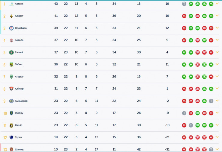 22 тур қорытындысы бойынша "Астана" 43 ұпаймен турнир көшін бастады. Екінші орындағы "Қайратта" 41 ұпай бар. Премьер-лиганың аяқталуына 2 тур қалды.