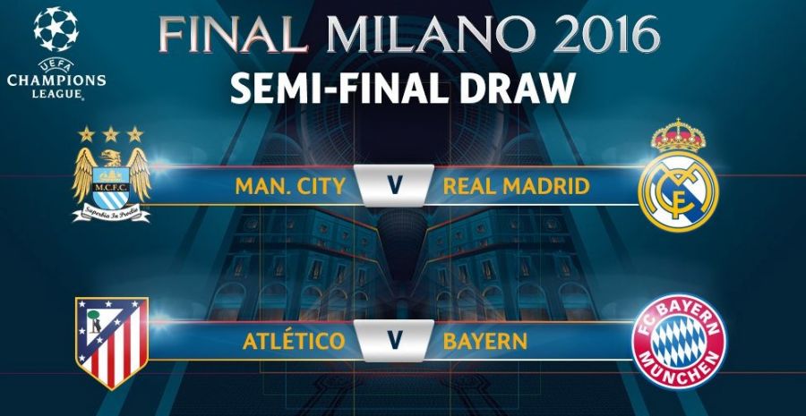 Жеребе қорытындысы бойынша ағылшындық «Манчестер Сити» мадридтік «Реалмен», ал мадридтік екінші клуб «Атлетико» мюнхендік «Баварияға» қарсы ойнайды. Бірінші ойындар 26-27 сәуірге, қарымта ойындар 3-4 мамырға жоспарланған.