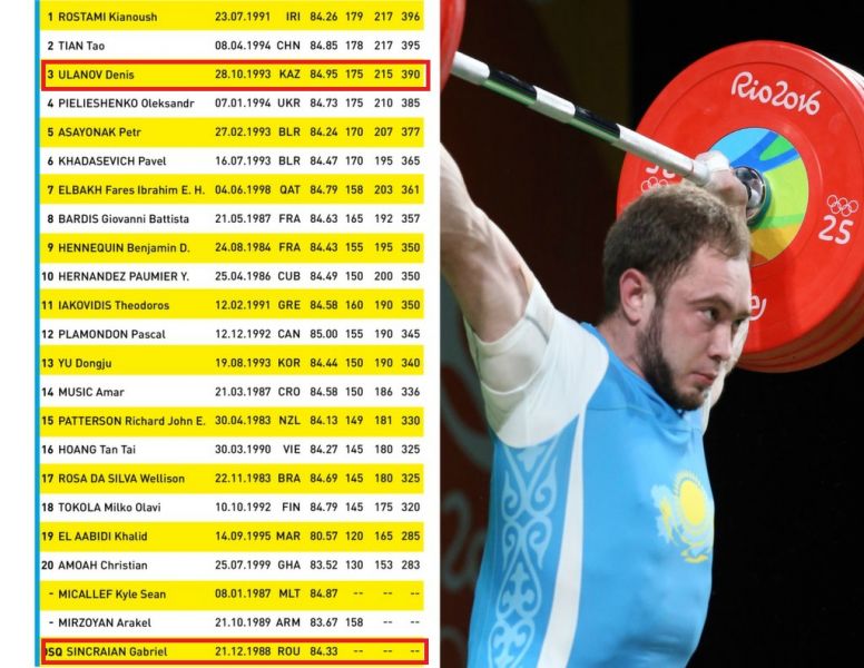 85 келіге дейінгі салмақта қола жүлдегер атанған румындық Габриэль Синкраянның допинг қолданғаны үшін нәтижелері жойылғаны көрсетіліп, халықаралық жарыстардан шеттетілгені жазылған. Нәтижесінде отандасымыз үшінші орын иегері ретінде көрсетілген.